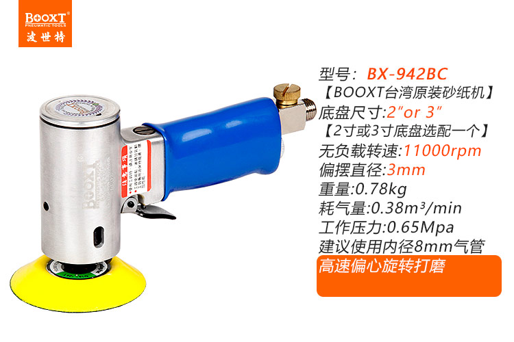 1.帶偏心式,裝砂紙打磨出來(lái)的效果是“霧”狀,帶細(xì)小亂絲的小紋路,適合后工藝需要做噴砂、烤漆,增加附著力。(標(biāo)配一般為3mm偏擺,可選配1.5mm,0.75mm偏擺度)