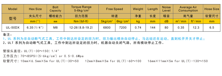 • 產(chǎn)品參數(shù): 螺栓能力:M8;扭力范圍:12-26Nm;轉(zhuǎn)速:7200rpm;凈重:0.74kg;長(zhǎng)度:144mm;噪音值:80dB;耗氣量:0.35立方米/分鐘;推薦氣管:6.5mm