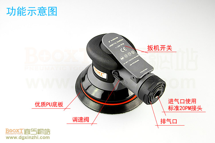 • 產(chǎn)品參數(shù): 底盤尺寸:5寸(125mm);轉(zhuǎn)速:11000rpm;偏擺:2.5mm;重量:0.78kg;使用氣壓:0.65Mpa;推薦氣管:內(nèi)徑8mm;耗氣量:0.53立方米/分鐘,使用時多加氣動油保養(yǎng)。
