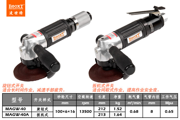 東莞市強勁五金工具有限公司提供臺灣BOOXT波世特品牌氣動工具,角向氣動打磨機MAGW-40A廠家直銷,首件享特價。咨詢熱線:4008301980