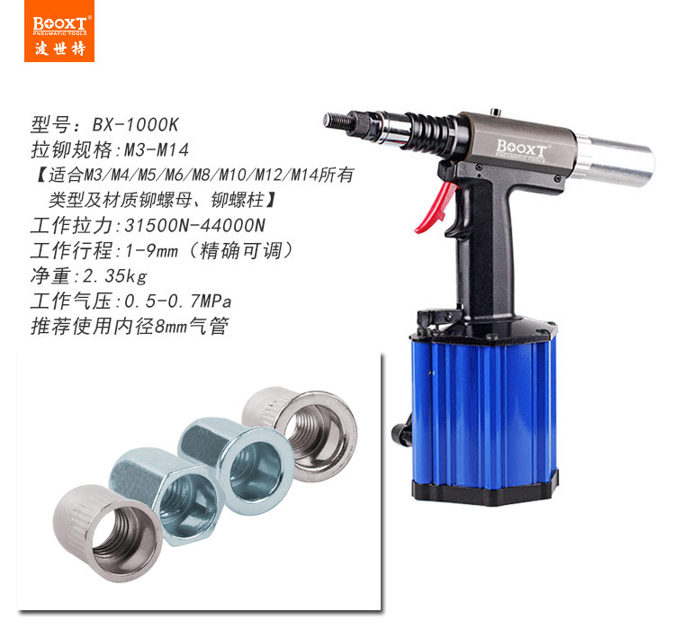 東莞市強(qiáng)勁五金工具有限公司提供BOOXT波世特品牌氣動工具,M14氣動拉鉚螺母槍BX-1000K廠家直銷,首件享特價。咨詢熱線:4008301980