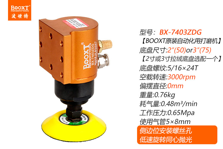 • 產(chǎn)品參數(shù): 底盤尺寸:50mm/75mm (2寸/3寸) 偏擺直徑:0mm 【同心】 空載轉(zhuǎn)速:3000rpm 【慢速】 重 量:0.76KG 耗 氣 量:0.48m3/min 【同心/慢速】