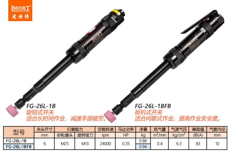 東莞市強(qiáng)勁五金工具有限公司提供臺(tái)灣BOOXT波世特品牌氣動(dòng)工具,高精密氣動(dòng)風(fēng)磨機(jī)FG-26L-1BFB廠家直銷,首件享特價(jià)。咨詢熱線:4008301980