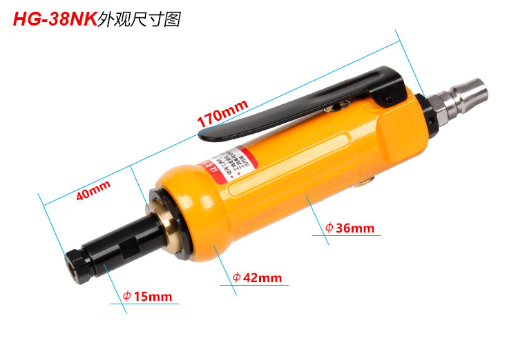 • 產(chǎn)品參數(shù): 夾頭能力:M6 【可選配M3夾頭】 空載轉(zhuǎn)速:22000rpm 細(xì)桿直徑:15mm 細(xì)桿長(zhǎng)度:40mm 全 長(zhǎng):170mm 重 量 : 0.54kg 耗 氣 量:0.45m3/min 【細(xì)桿/專業(yè)型】
