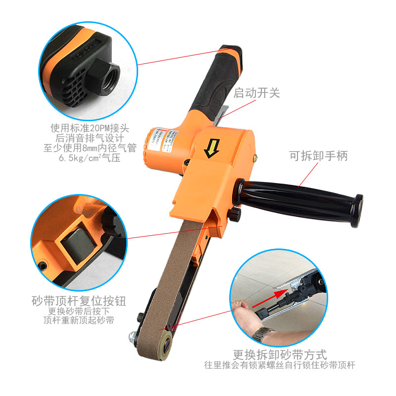 • 產(chǎn)品參數(shù): 砂帶尺寸:20×520mm; 空載轉(zhuǎn)速:17000rpm; 工具長度:406mm; 工具重量:1.32kg; 馬達(dá)功率:0.5HP; 耗 氣 量:0.4立方米/分鐘; 使用工作氣壓:0.65Mpa; 推薦使用內(nèi)徑8mm氣管; 平時(shí)使用應(yīng)多加氣動(dòng)油保養(yǎng)