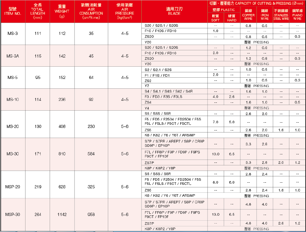 3.慎選本體及刀刃: 依客戶所要剪的工件,選配最適合的本體跟刀刃.以小剪大無法達成工作上的需求 (一般而言要以小剪大,就是加大空氣源 ,如此容易造成本體及刀刃損壞。) 以大剪小,刀刃使用壽命將嚴重減少。